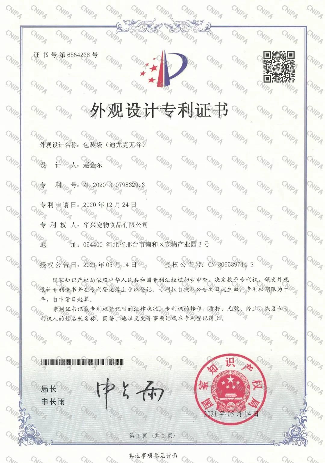 近日,國家知識產(chǎn)權(quán)局依照中華人民共和國專利法經(jīng)過初步審查,授予迪尤克無谷包裝袋外觀設計專利證書,專利號:ZL 2020 3 0798329.3,并在專利登記薄予以登記。