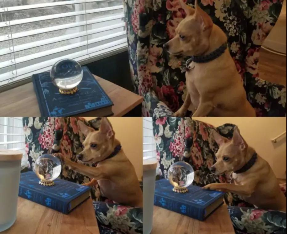 主人剛開始不解,回來站到狗狗的角度,他才發(fā)現(xiàn)原來通過水晶球可以看見窗戶外的人行道,要是看到表現(xiàn)怪異的人,狗砸就會更不得鉆進(jìn)球里去視察......
